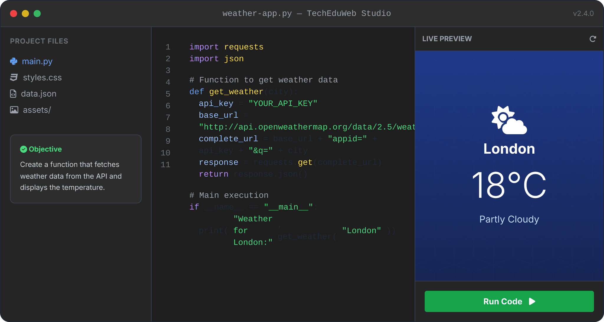 ผู้เรียนสามารถเขียนโค้ดจริงทั้ง HTML, CSS, JavaScript, Python และอื่น ๆ ภายในสภาพ แวดล้อมแบบ Sandbox ทดลอง ได้อย่างอิสระโดยไม่ทำให้ระบบ เสียหายเห็นผลลัพธ์ทันทีแบบ